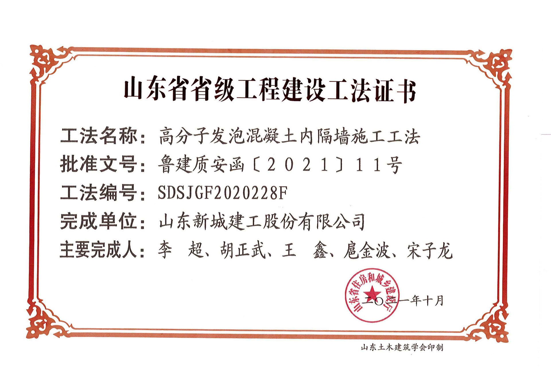 • 2021省级工程建设工法--高分子发泡混凝土内隔墙施工工法